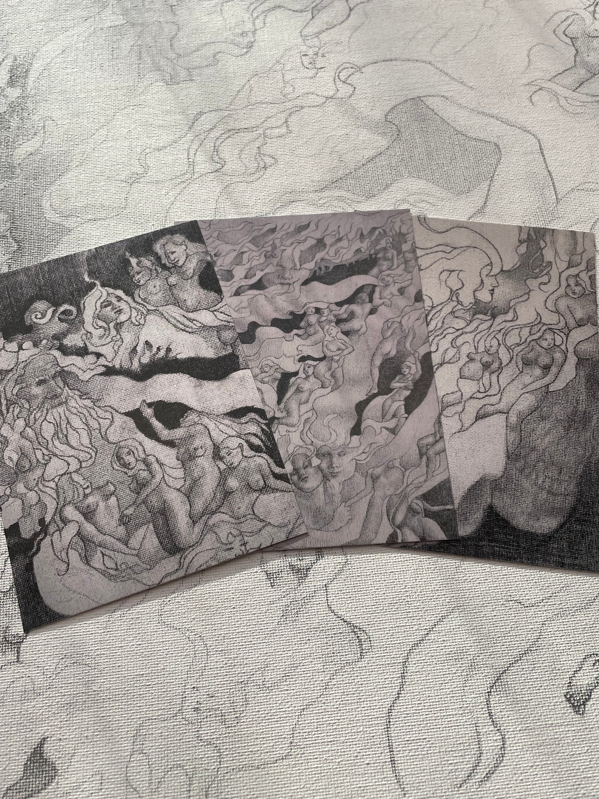 Six A6 (105 × 148 mm) art postcards, each bearing a fragment of the unseen realm: